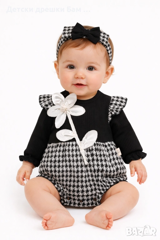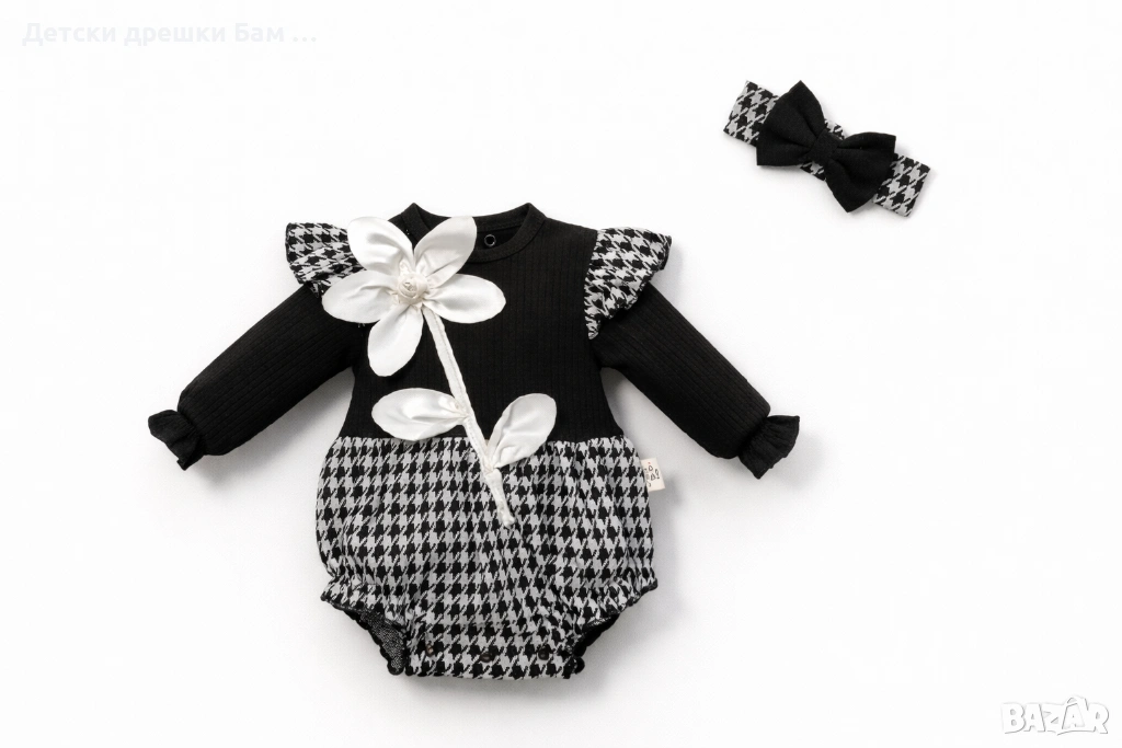 Черно-бял ромпър с ефектен пепит мотив, красиво сатенено цвете и нежни воланчета на раменете – наслада за окото и перфектен избор за специални моменти.