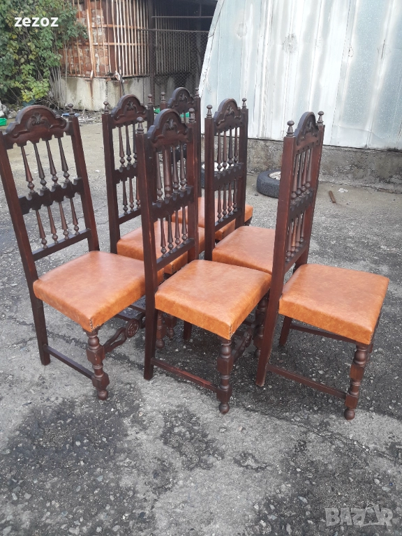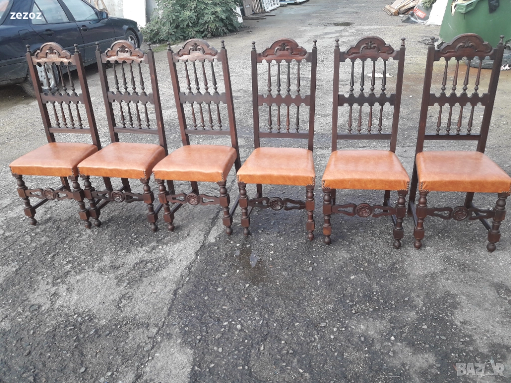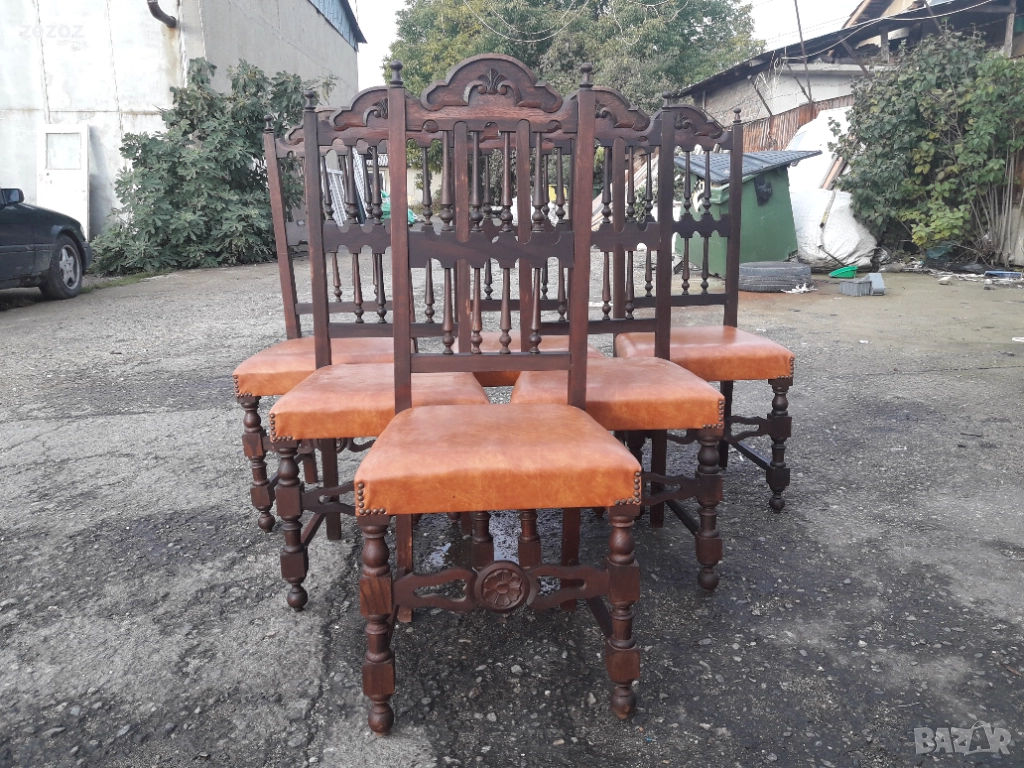 Антикварни столове от началото на 20 век.Масив махагон.Изработени в стил испански ренесанс.Напълно здрави.Дърворезба.След реставрация-разглобени и наново сглобени по оригиналната технология,по която са произведени-без пирони.Размери-