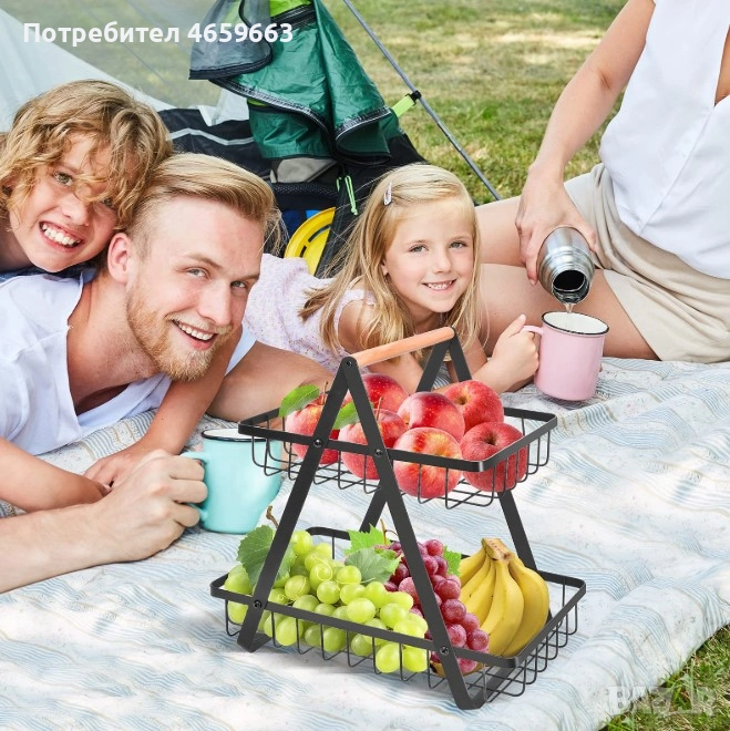 Декоративна кошница за плодове, изработена от метал, на два етажа и дървена дръжка