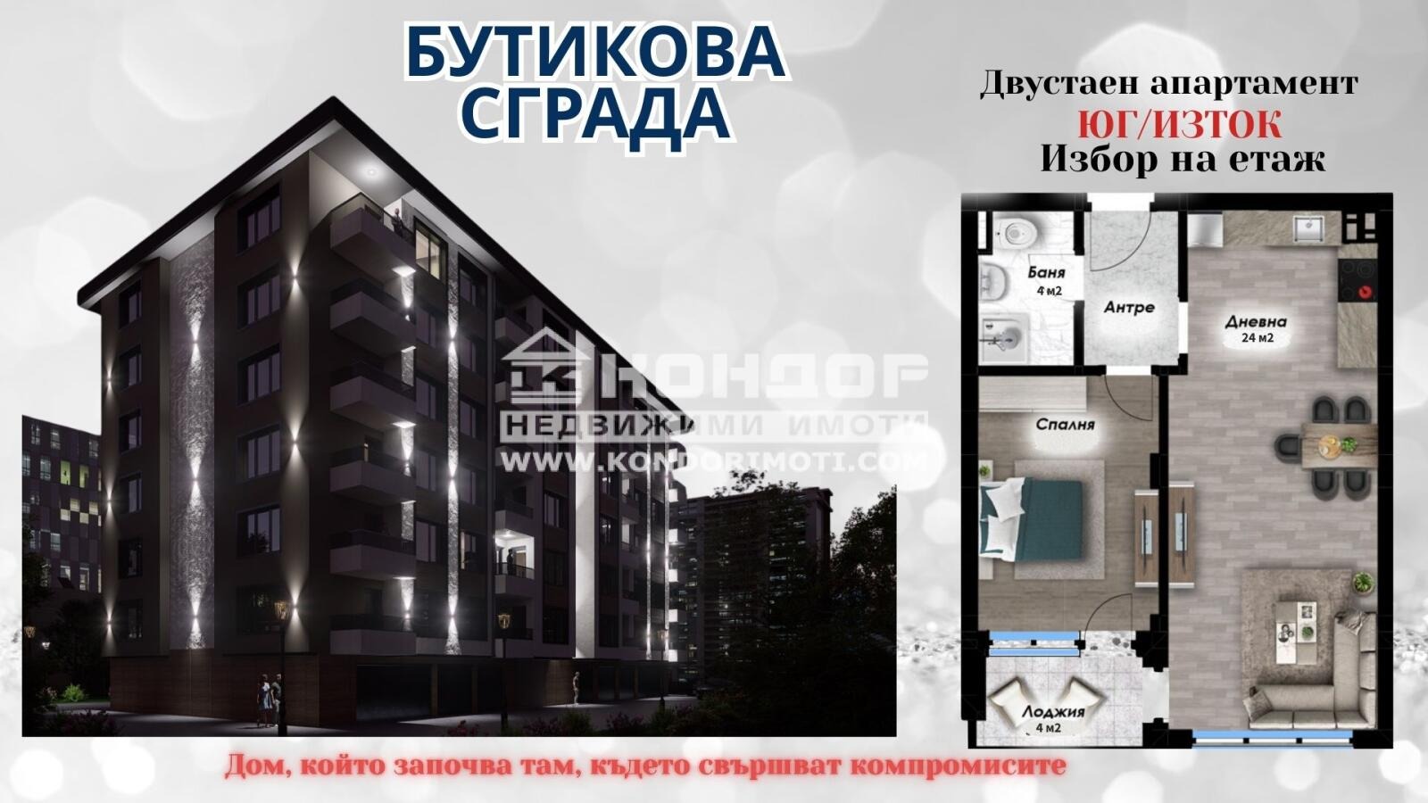 Оферта 68331 - Предлагаме ви възможността да си закупите жилище в самостоятелна ЛУКСОЗНА СГРАДА в един от най - бързо развиващите се райони с лесен достъп към Централната част на града !!! Жилището се състои от дневна 24кв.м. с трапезария и кухненски бокс, самостоятелна спалня, баня с WC, входно антре и обща тераса. Сградата се отличава със съвременна архитектура в район с отлични комуникации. Изпълнява се от реномирана Строителна Компания, която разполага с множество готови сгради, като може да ви покажем готови жилища, за да видите качеството на изпълнение /приложен е снимков материал от готова сграда на същата строителна компания. Апартаментите ще бъдат отвършени според всички изисквания за съвременно строителство - блиндирана врата, 6-камерна дограма. Луксозно завършени общите части, двойна хидро и топло изолация, италиански хидравличен асансьор, гранитено стълбище, алуминиев парапет. Паркирането е решено със външни Паркоместа както и Партерни и Подземни Гаражи !!! Отлична Инвестиция с Възможност за разсрочено плащане в рамките на строителството !!!