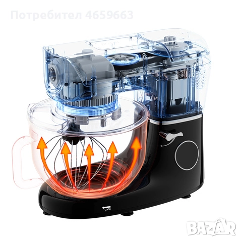 три приставки (кука, миксер, разбивачка), богат набор от аксесоари (шпатула, сепаратор за яйца, торбички за сладкарски изделия) и купа с обем 5,5 л ви подготвят за всяко кулинарно предизвикателство – от пандишпан до прясна паста