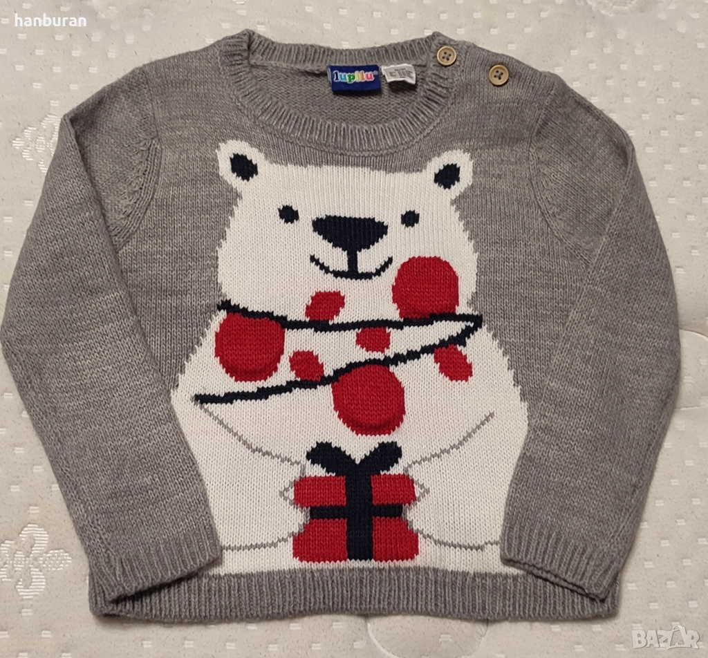 Бебешки коледен пуловер със светлини. Размер 86, в отлично състояние, без забележки. Като се чукне леко с ръчичка по червените кръгчета, те мигат.