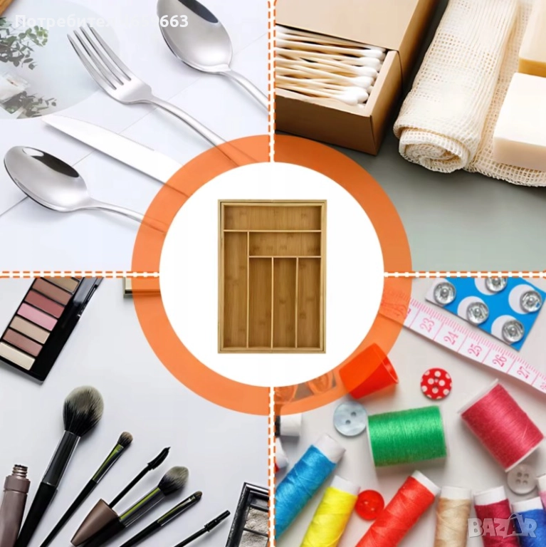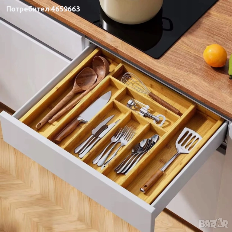 BAMBOO - органайзерът за кухненски чекмеджета, изработен от бамбуково дърво, има проста форма, благодарение на която се вписва в модерните кухни. Бамбуковото дърво е подходящ материал за производството на кухненски аксесоари, защото има бързосъхнещи свойства, абсорбира най-малко бактерии и е елегантно. Затова можем свободно да измиваме такава вложка за чекмедже под течаща вода, без да се страхуваме, че дървото ще абсорбира влага и в него ще се развият гъбички и бактерии.