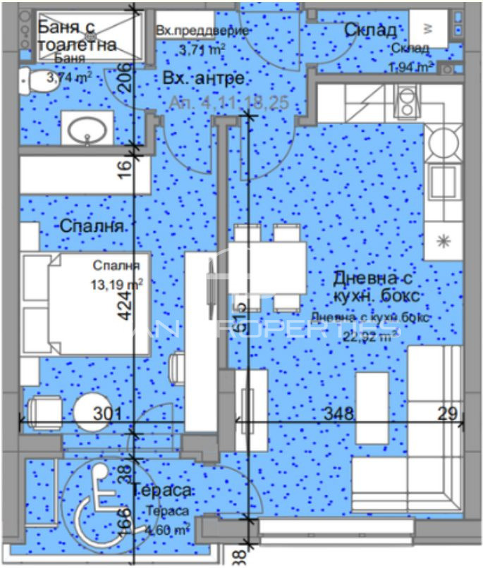 Имотът е ситуиран на 5-ти жилищен етаж и разполага с площ 67 кв.м. кв.м., разгърната по следния практичен начин: Входно антре, дневна с кухненски бокс, спалня, баня с тоалетна, тераса.