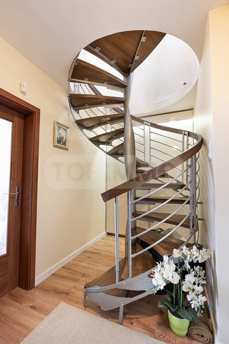 елегантна дизайнерска стълба, водеща към второ ниво.