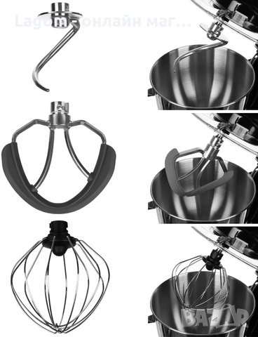 - 3 ВИДА НАКРЪСТНИЦИ – комплектът включва 3 накрайника за приготвяне на ястия. Миксерът със силиконови ленти се използва за перфектно смесване на съставките на тестото. Куката е предназначена за добро месене на тестото, например тесто с мая, а тепсия се използва за разбиване на леки съставки като сметана или белтъци.