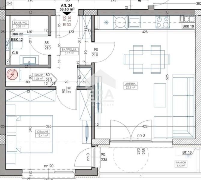 ДВУСТАЕН ЮЖЕН АПАРТАМЕНТ В НОВОСТРОЯЩ СЕ ЖИЛИЩЕН КОМПЛЕКС С АКТ 14. ЕРА Варна Тренд предлага за продажба двустаен апартамент със застроена площ 58,63 кв.м (69,24 кв.м с общите части), разположен на пети етаж от общо 6 етажа. Състои се от входно предверие (5,17 кв.м), дневна с кухненски бокс (22,2 кв.м), спалня (12,41 кв.м), общ за двете стаи балкон (5,34 кв.м), баня с тоалетна (3,38 кв.м) и килер (1,54 кв.м), както и 17,22 кв.м идеални части от поземления имот. Изложението е изцяло юг. Статутът е на апартамент.