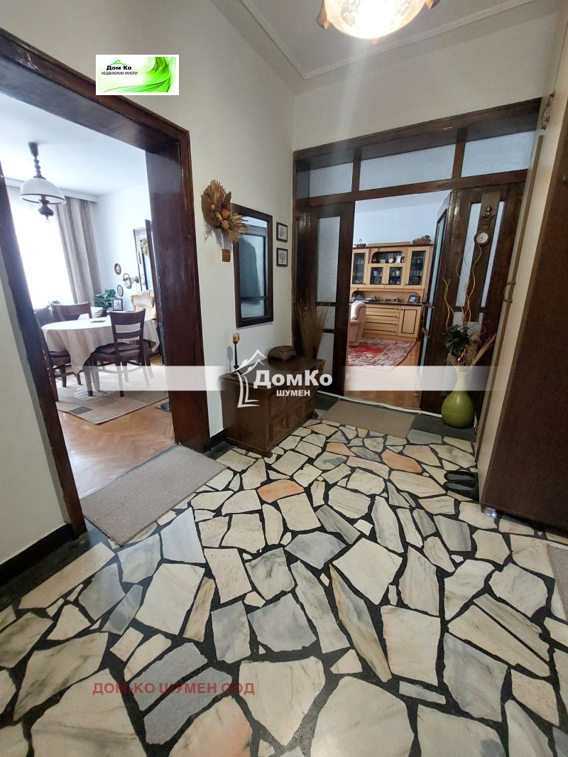 'Дом-Ко Шумен' Ви предлага за продажба етаж първи от триетажна къща с площ от 125 кв.м. в района на Математическа гимназия. Жилището е със следното разпределение: входно антре, кухня, трапезария, хол, две спални, баня, тоалетна, две тераси, прилежащо избено помещение и таванско помещение и идеална част от двор. Имота е топъл и просторен с много добро функционално и пространствено разпределение, обзаведен и оборудван с всичко необходимо, готов за нанасяне. Разположен на 1ви етаж/над гаражи/ в тухлена кооперация с отлично поддържани общи части. Имотът се продава обзаведен. Сградата е с отлична локация, намира се на пешеходно разстояние от детски градини, учебни заведения, супермаркети, аптеки, заведения за хранене, спирки на градския транспорт за бърз и лесен достъп до всички части на града. Има опция за покупка на гараж, който не е включен в цената.