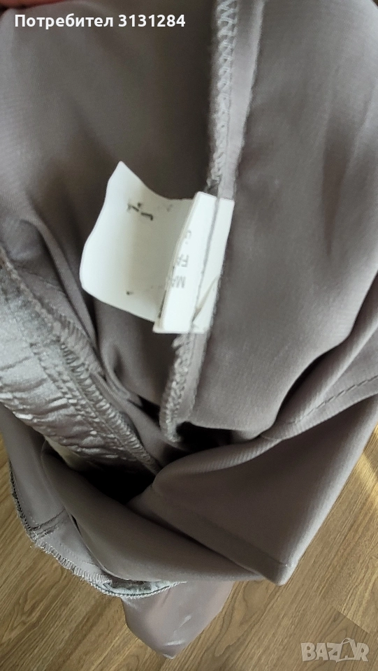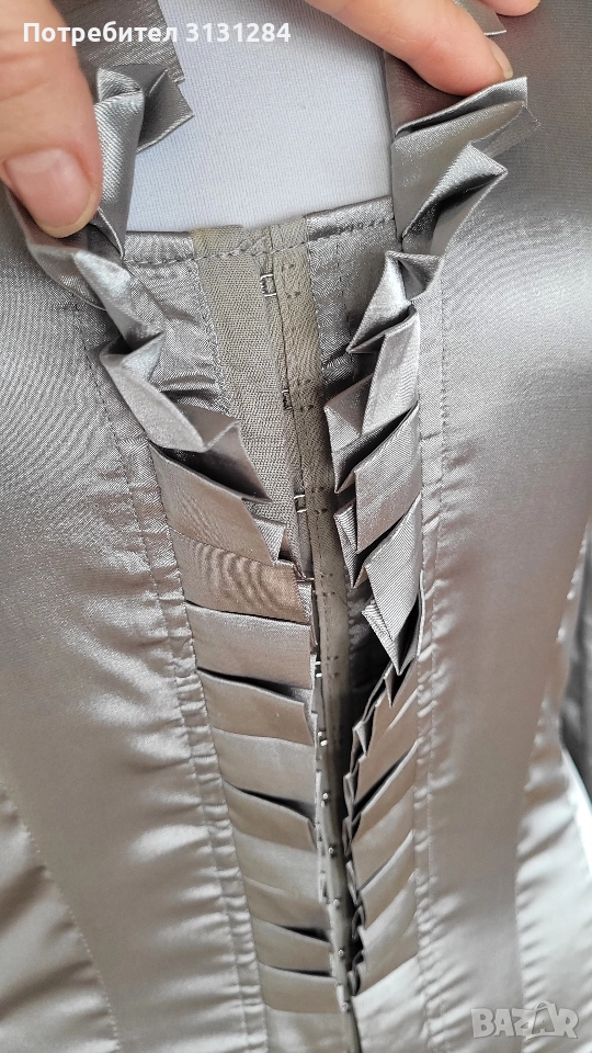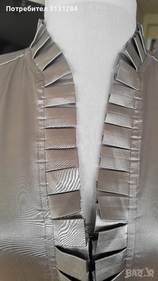 Елегантна сребрена нарядна блуза от еластична сатенена материя. Има закопчаване отдолу, като боди. Сьстояние е перфектно. р.44