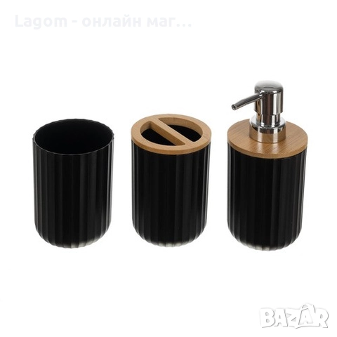 - ЧАША ЗА ЧЕТКИ ЗА ЗЪБИ И ЧАША ЗА ОПЛАКВАНЕ НА УСТАТА – комплектът включва две чаши – едната за ополаскване на устата по време на миене на зъбите, а втората е за съхранение на четките за зъби. Чашата за четки за зъби е снабдена с бамбукова капачка с два големи отвора, които улесняват разделянето на четките, като не им позволяват да се допират една до друга. И двете чаши се отличават с елегантно черно покритие с ребриста повърхност, което им придава модерен вид.