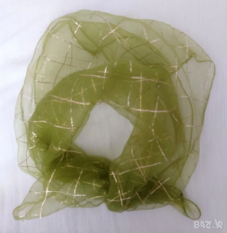 Зашеметяващ дамски шал фишу. Нежна резеда със златна нишка. Голям квадрат 70/70 см. Цена 12 лв. Изпраща се с 10% отстъпка от общоприетата куриерска такса.