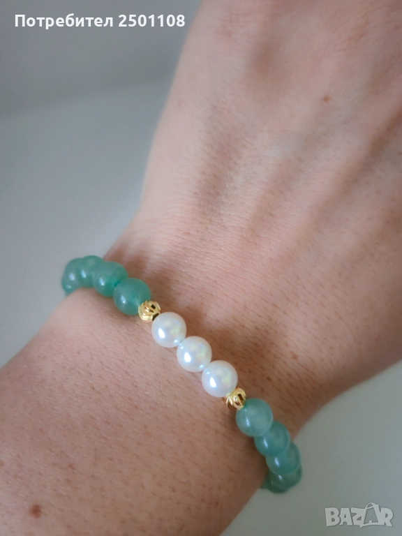 Гривна от естествени камъни – Зелен Авантюрин, перли и позлатени мъниста 18K → Обява 52550238