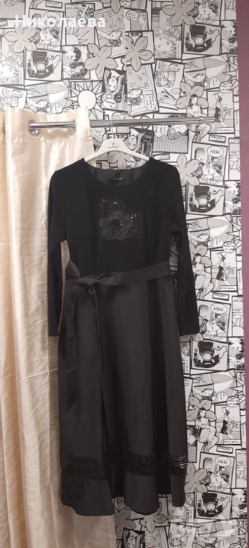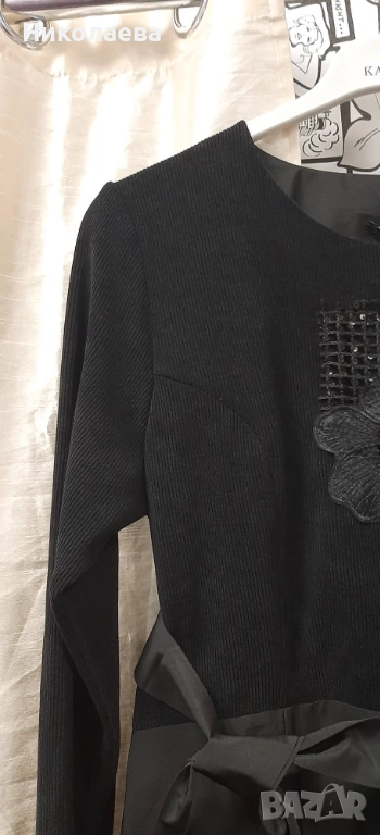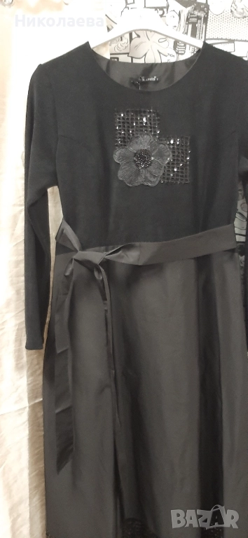 Обло деколте. дълъг ръкав, странични скрити джобове, роклята е с рязана талия и е леко вталена със страничен скрит цип. Горна част от меко трико тип рип с еластичност на ширина апликация от ефектно цвете, долна част от плат без еластичност тип промазка- не прозира с вградена лента от мрежа с пайети.Към роклята има колан за по стилна визия!