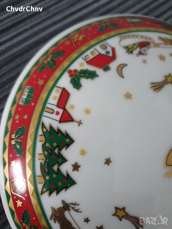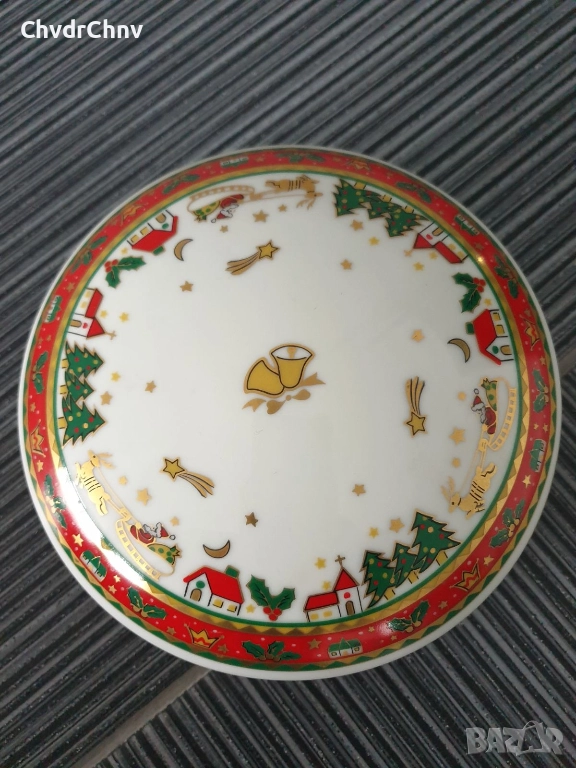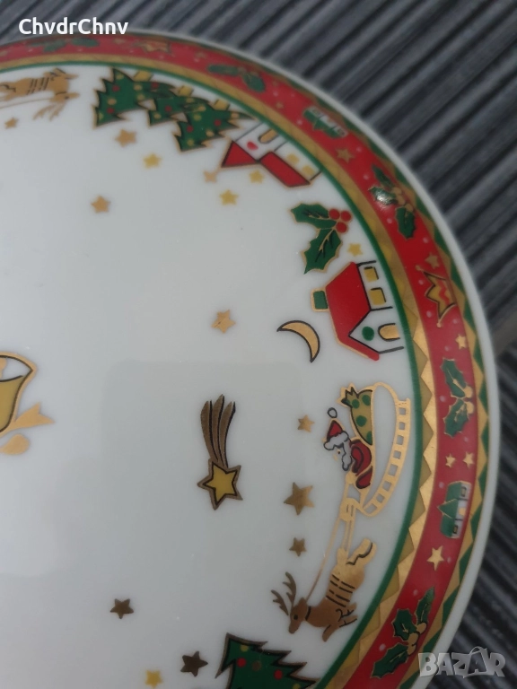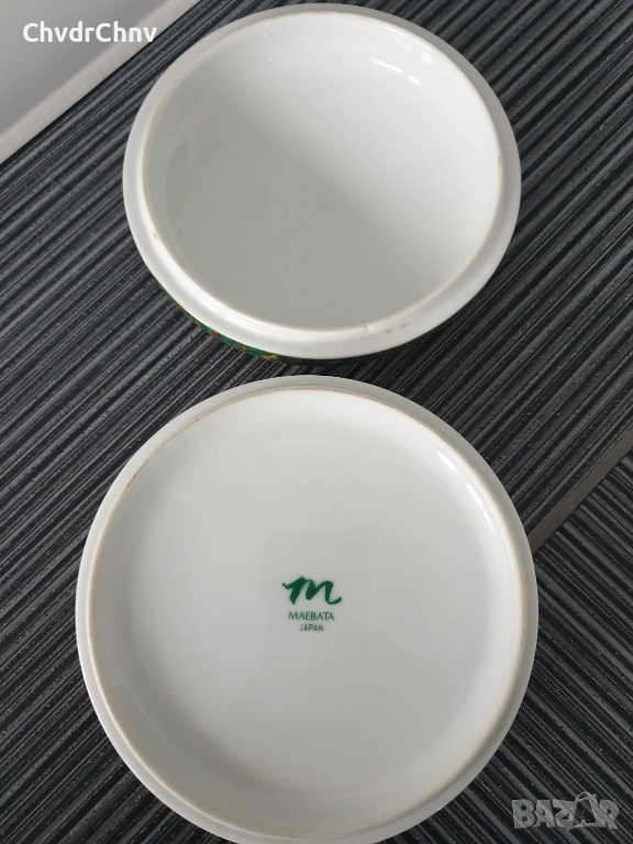 Диаметър 16 см, височина/дълбочина 8 см, отдолу с маркировка/печат на Maebata Japan (показан), декорация с 22К злато, производство Япония 1990-те, без забележки (здрави ръбове и рисунки).