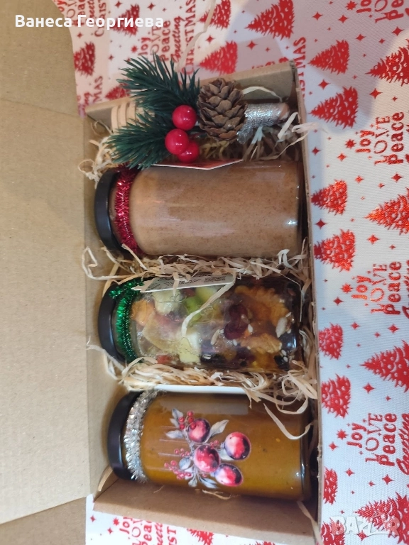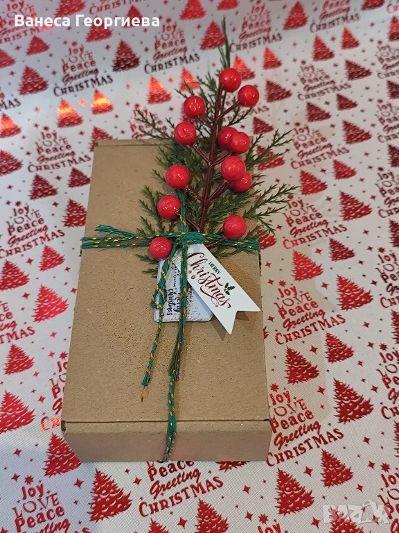 Комплектът пристига в елегантна кутия, красиво декориран с празнични елементи и етикети.