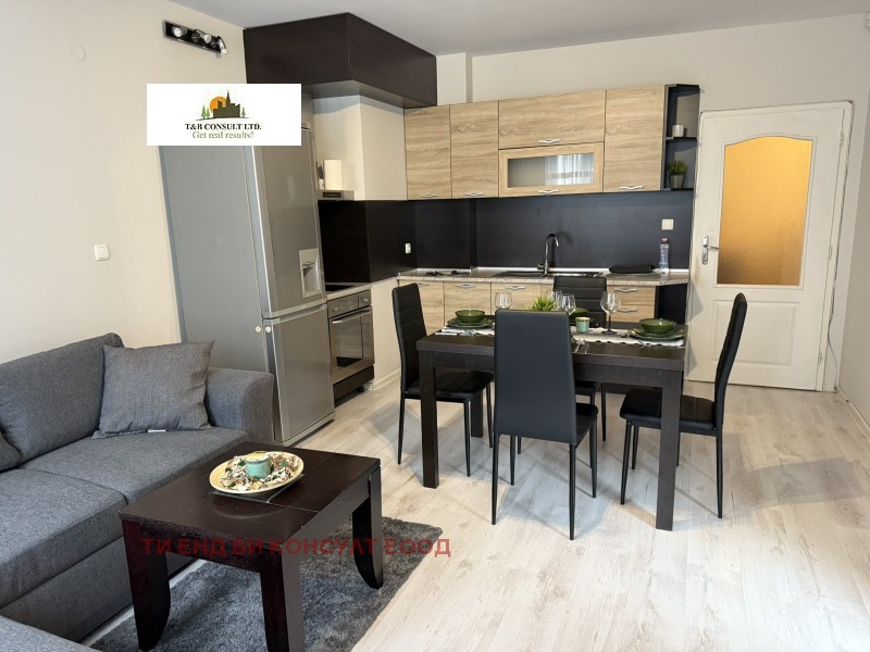 Имотът е след основен ремонт, напълно обзаведен и оборудван с всичко необходимо за бъдещите си наематели. Разпределението му е следното: входно антре, хол с кухненски бокс, две спални, баня с тоалетна, мокро помещение и две тераси.