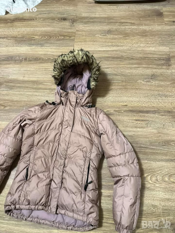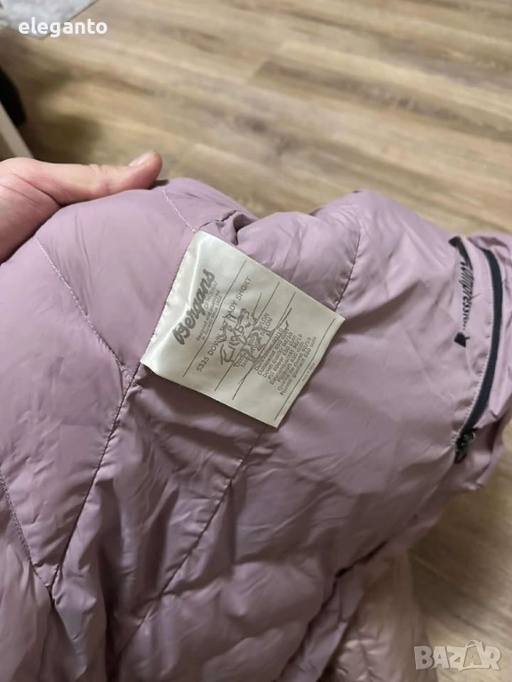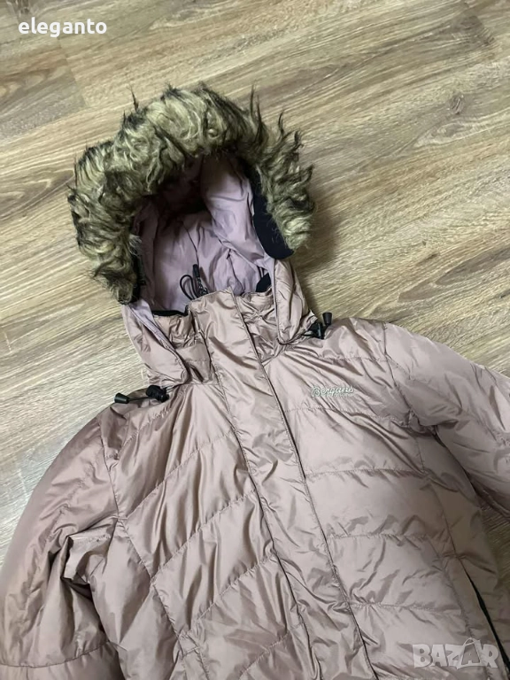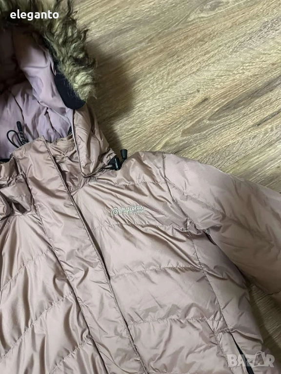 дамско пухено яке Bergans of Norway с пълнеж 650, Това е изолирано пухено яке в пепел от рози цвят и кожена облицовка на качулката.
