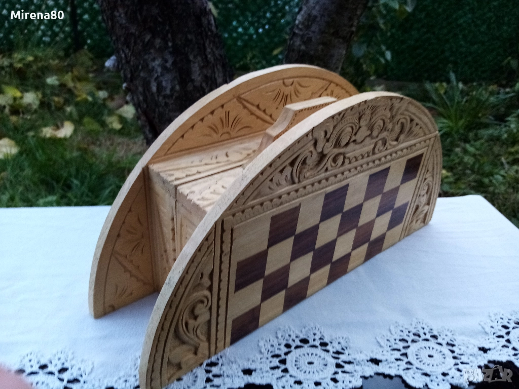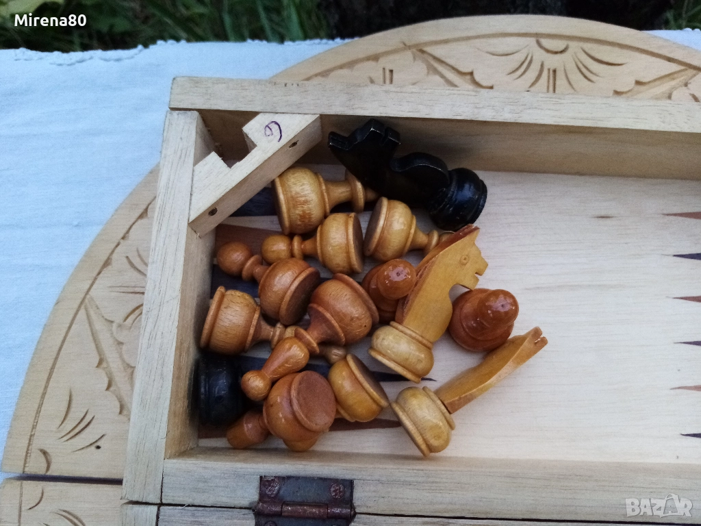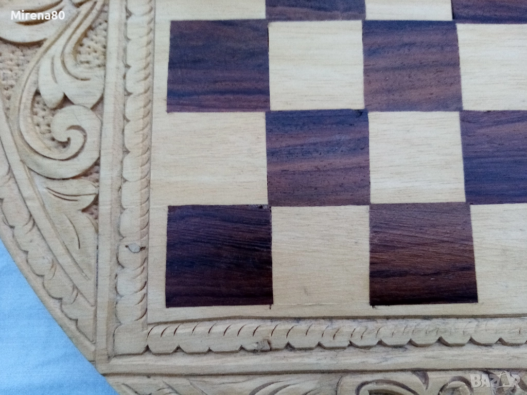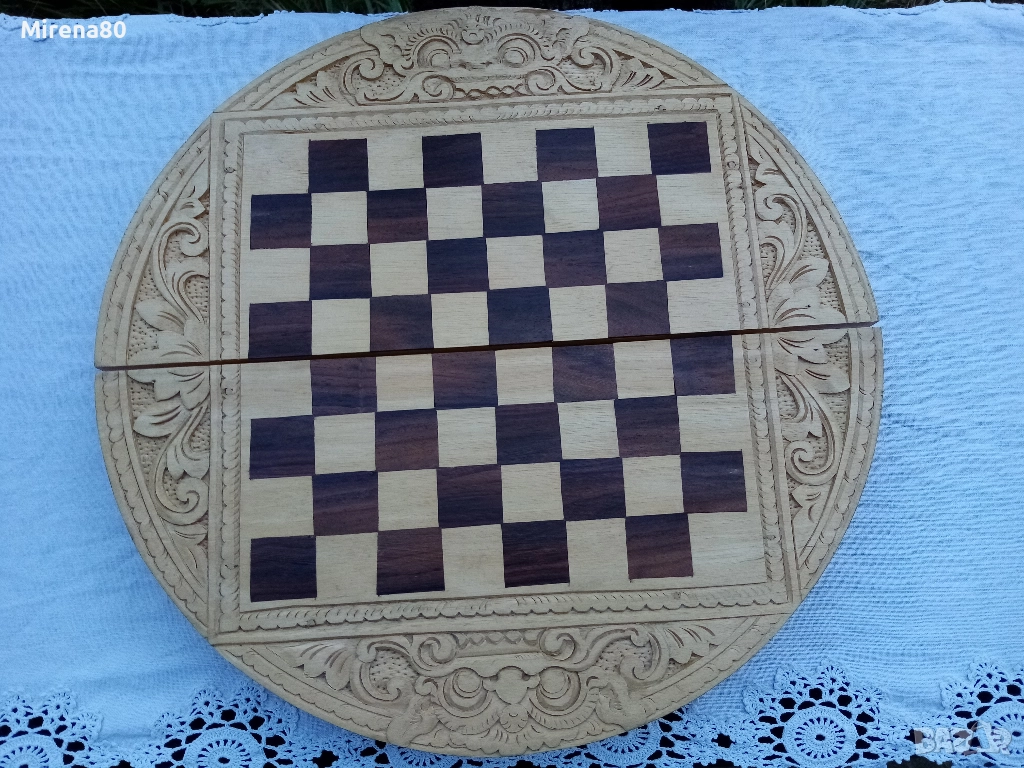 Представям ви една рядка и много интересна вещ - истинска находка. Дъска за шах/табла, която се сгъва и е много удобна за пренасяне - на почивка и т.н. Материалът е липа, с много богата орнаментика, изцяло ръчна изработка. Към него има пълен комплект фигури за шах, също дървени. Размер в разпънато състояние - диам. 38 см. За колекционери !