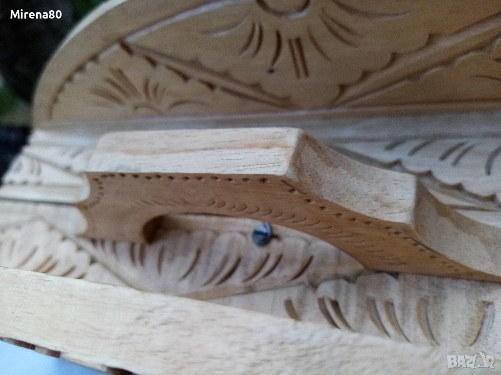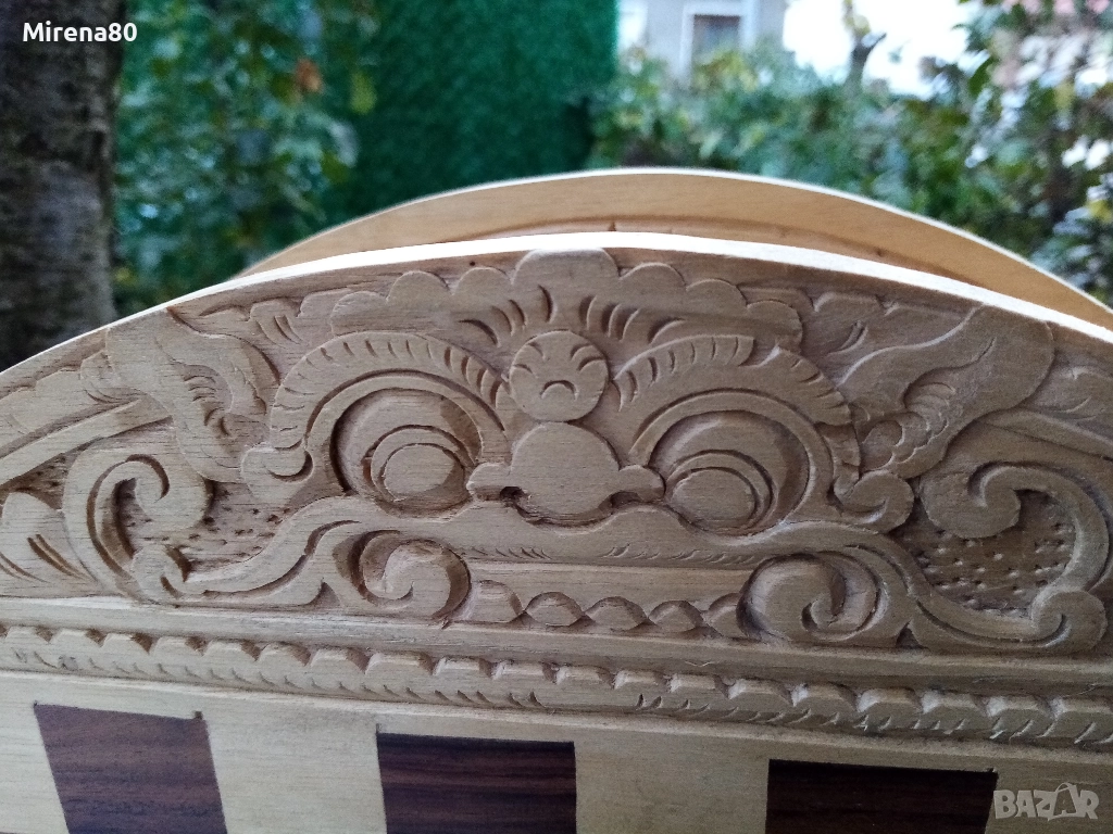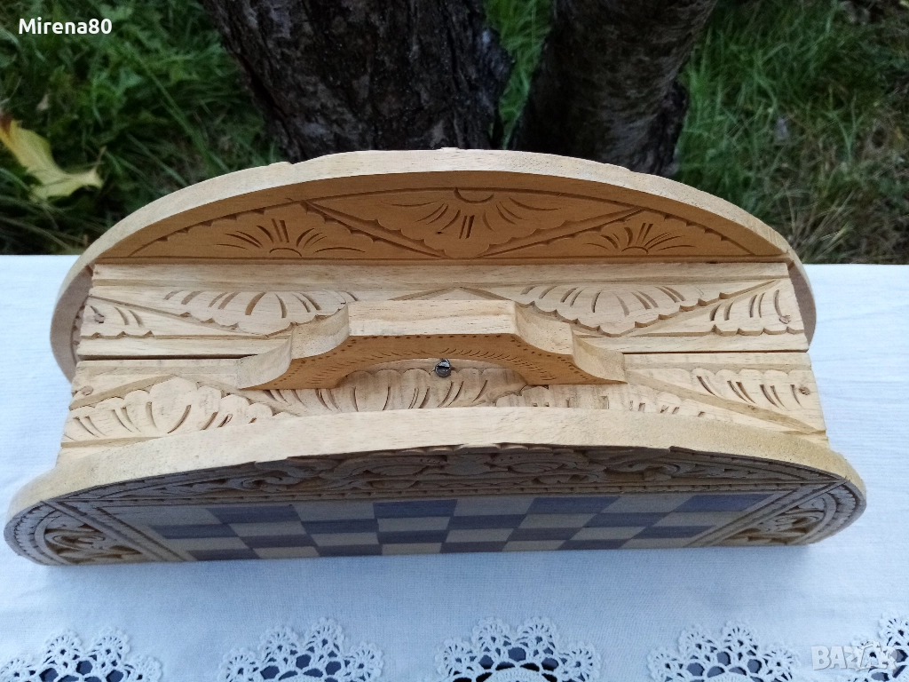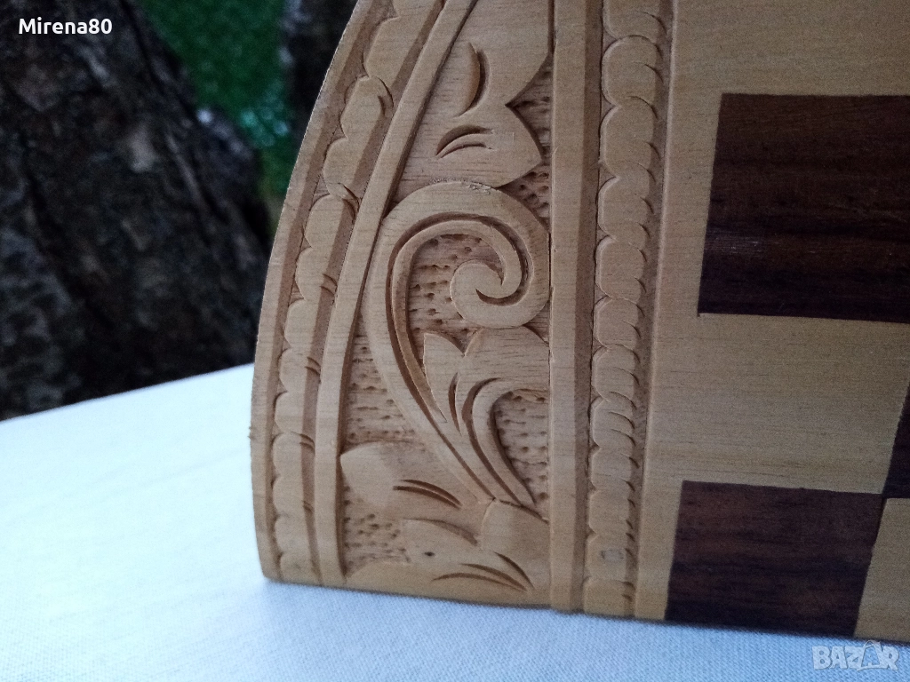 Представям ви една рядка и много интересна вещ - истинска находка. Дъска за шах/табла, която се сгъва и е много удобна за пренасяне - на почивка и т.н. Материалът е липа, с много богата орнаментика, изцяло ръчна изработка. Към него има пълен комплект фигури за шах, също дървени. Размер в разпънато състояние - диам. 38 см. За колекционери !