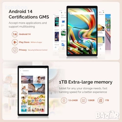 Android 14 и осемядрен процесор 2.0 GHz: Таблетът е оборудван с най-новата система Android 14, която работи гладко, по-бързо и осигурява повече поверителност. Той е оборудван и с мощен осемядрен процесор до 2.0 GHz за превъзходна производителност, което подобрява скоростта на изпълнение на програмите и плавността на сърфирането в интернет, за да подобри потребителското изживяване.