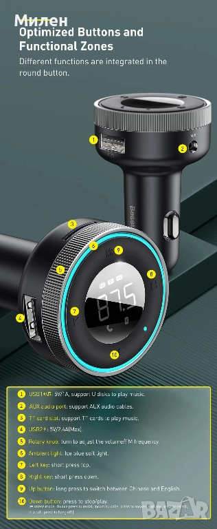 звука и FM честотата.С FM трансмитер с бързо зареждане можете да зареждате телефона си,