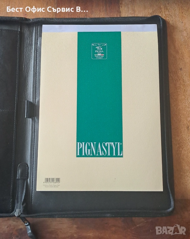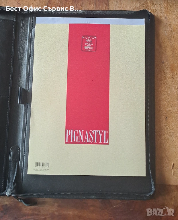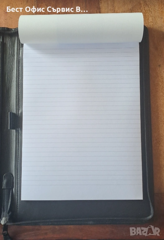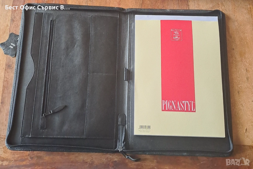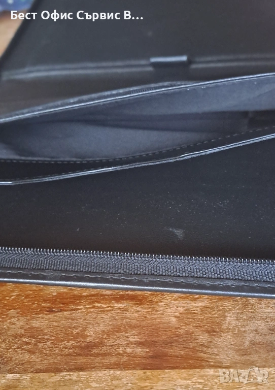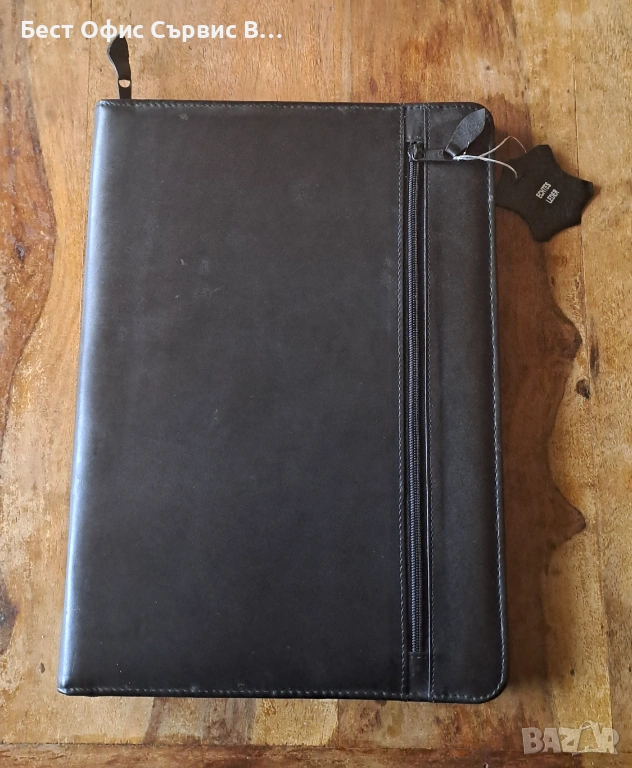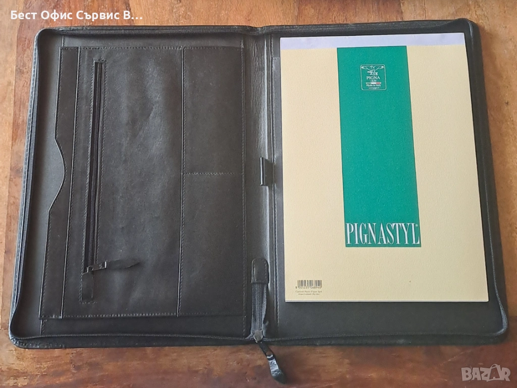 Продавам папка за документи естествена кожа черна с цип А4 внос от Италия. Има 5 джоба за визитки и документи, единият може да се затвори с цип. От външната страна също има джоб, който се затваря с цип. Има и 1 място за химикалка. Бележникът за писане с редове е с размери 21x29,5 см и има 70 листа. Папката е с размери 25,7x36x2,4 cм. Чисто новa. Внос от Италия. От частна колекция. За ценители.