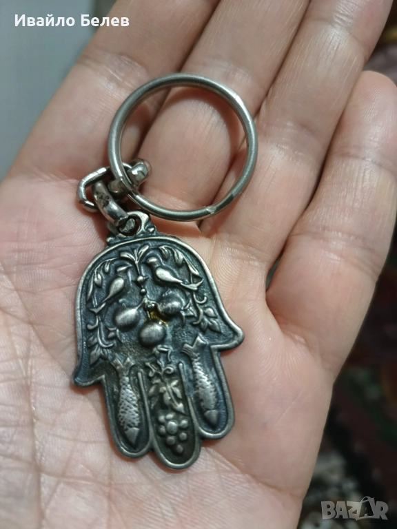 Висулка/ключодържател с форма на Ръката на Фатима (Hamsa) – популярен амулет в Близкия изток и Северна Африка, който се смята за защита срещу уроки (злото око).