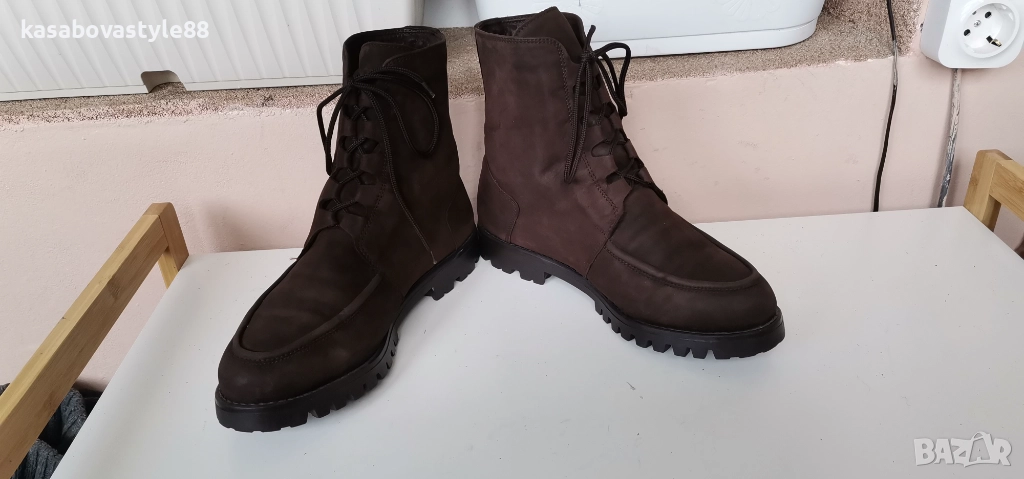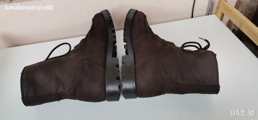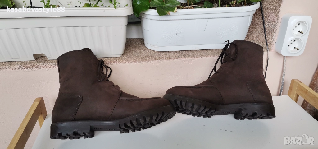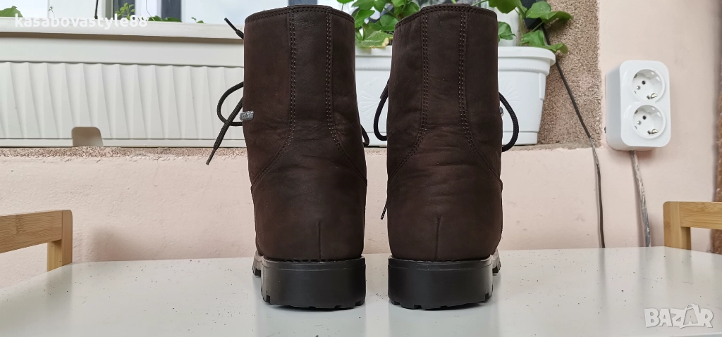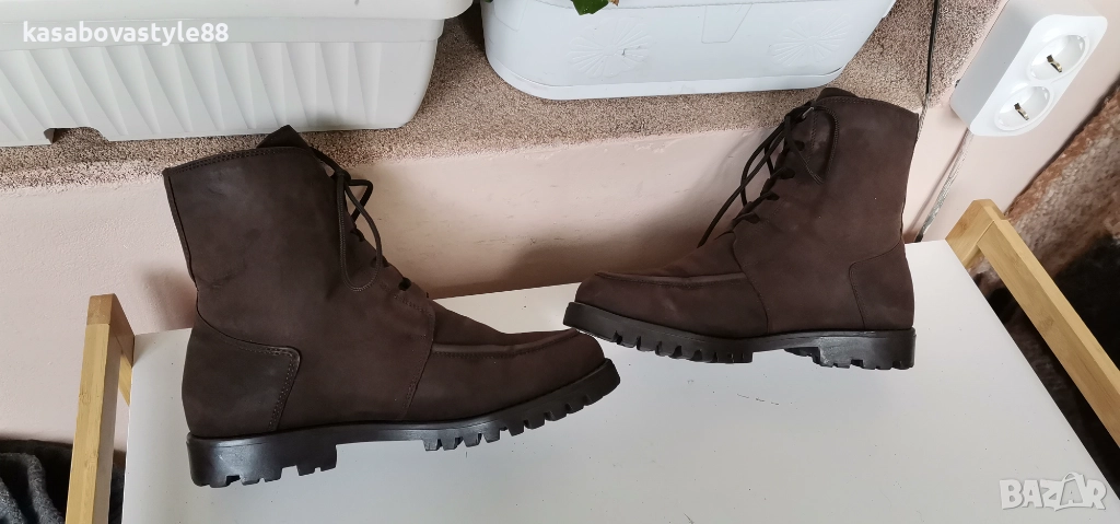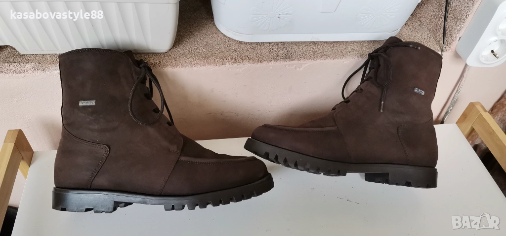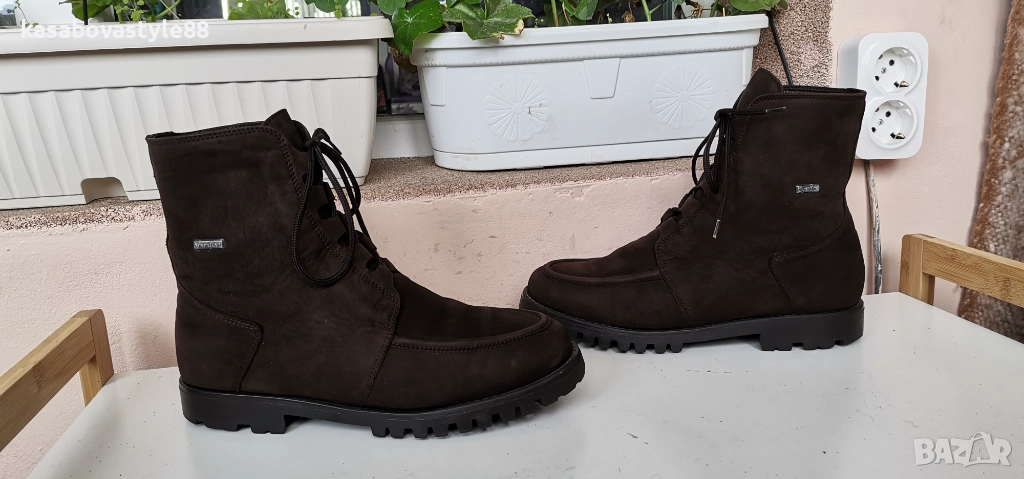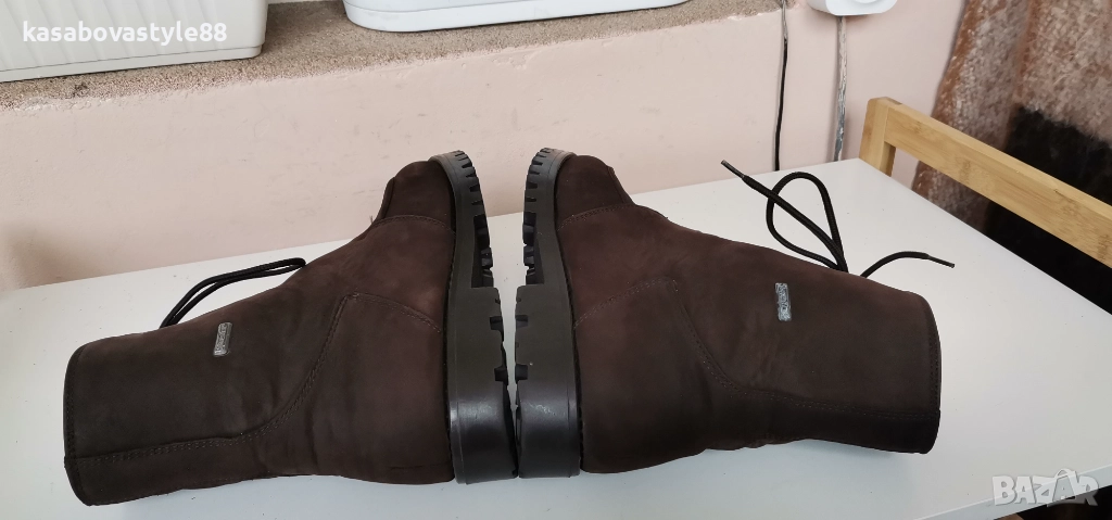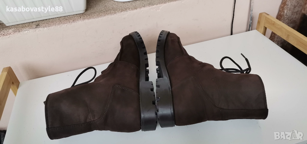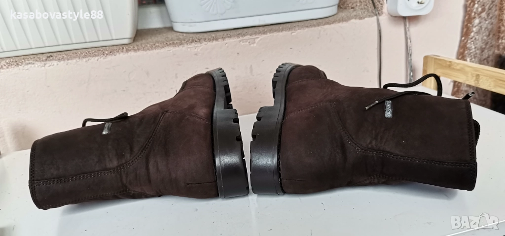 Дамски топли ботушки от естествена мека на допир кожа в кафяв цвят. В топ състояние! Перфектни отвътре и отвън. Отвътре разполагат с много топла подплата и комфортна пухкава вадеща стелка. Ходилото е с перфектна еластичност, стабилни и непързалящи се. Мембраната Sympa tex не позволява пропускането на вода и изолира от студа. Дължина на стелка 27.5см.Цялостна височина отзад 18.5см.Ток-2 5см.