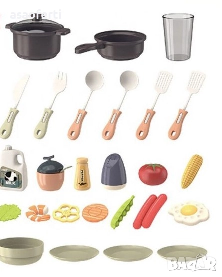 Множество Аксесоари: Комплектът включва 29 елемента кухненски прибори, тенджери, чинии, чаши и имитация на хранителни продукти.