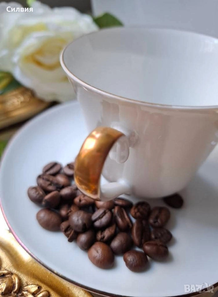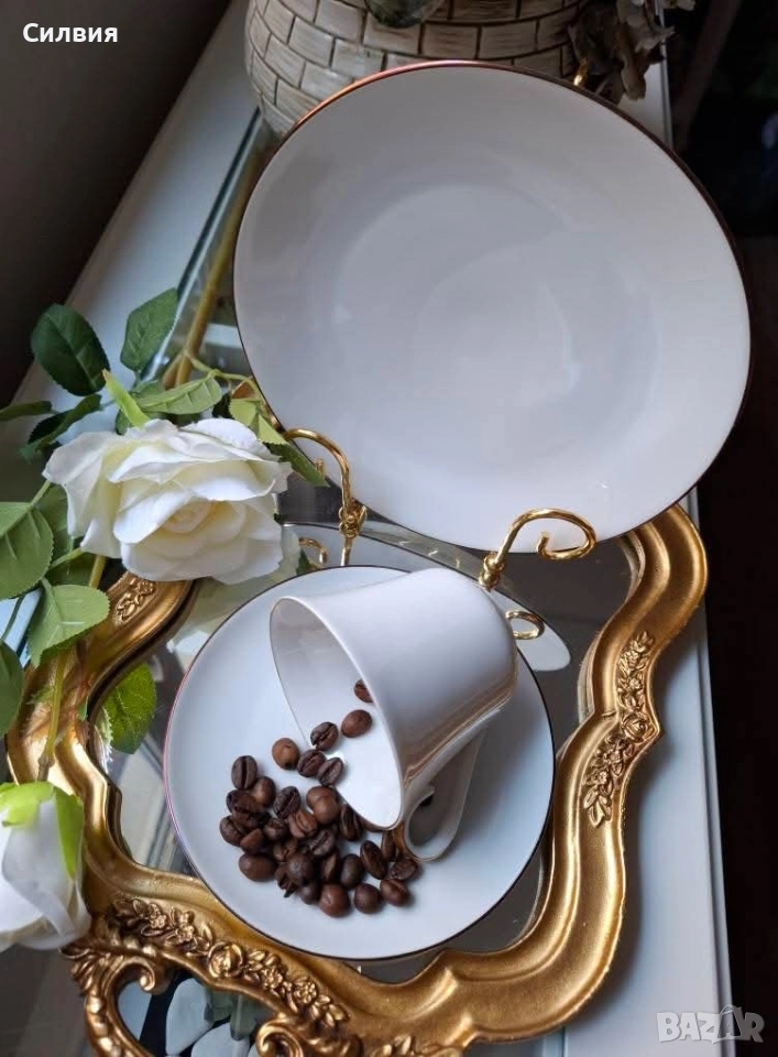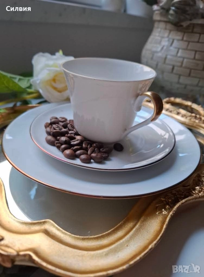 Потопете се в атмосферата на класическа елегантност с този изящен троен сет за кафе или чай от реномираната немска компания Alka-Kunst Alboth & Kaiser. Произведен между 1957 и 1960 година, този комплект е истинско бижу от костен порцелан, което носи духа на отминали времена. Всяко парче е майсторски изработено с внимание към детайла – от чашката с вместимост 200 мл, идеална за вашето сутрешно кафе или следобеден чай, до чинийката и десертната чиния, които я допълват. Златните акценти по дръжките и ръбовете на съдовете придават царствен завършек и изискан вид. Този комплект е повече от обикновени съдове – той е елемент от историята, идеален за колекционери или за всеки, който цени красотата на класическия, винтидж стил. Добавете нотка разкош към ежедневните си ритуали или направете незабравим подарък на любим човек. Цена 5️⃣0️⃣лв.1 сет •✽✧✽•°”˜🦋”°•✽✧✽•°”˜🦋”°•✽✧✽•°”˜🦋”°•✽✧✽•°”🦋˜”°•✽✧✽•