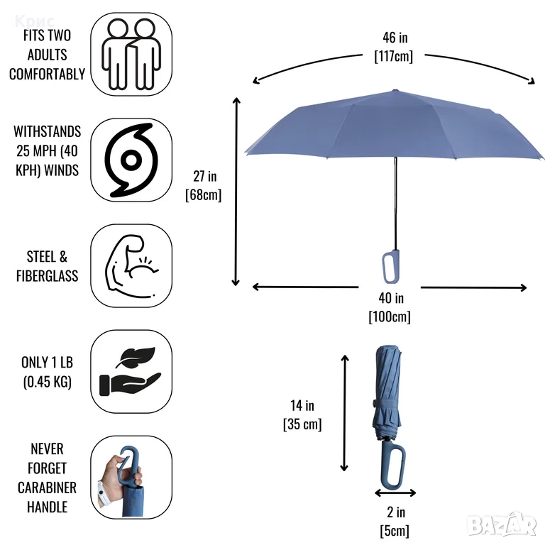 Голям автоматичен сгъваем чадър → Обява 52558172