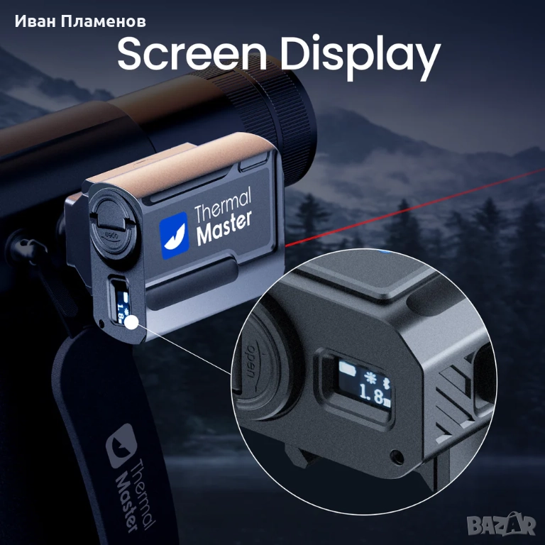 - Уредът се състои от термален сензор с ръчна настройка на фокуса за близо и далеч. Към него е включена ръкохватка, която е много здрава и защитава сензора от удари и влага. В дръжката има вграден лазерен пойнтер и батерия.