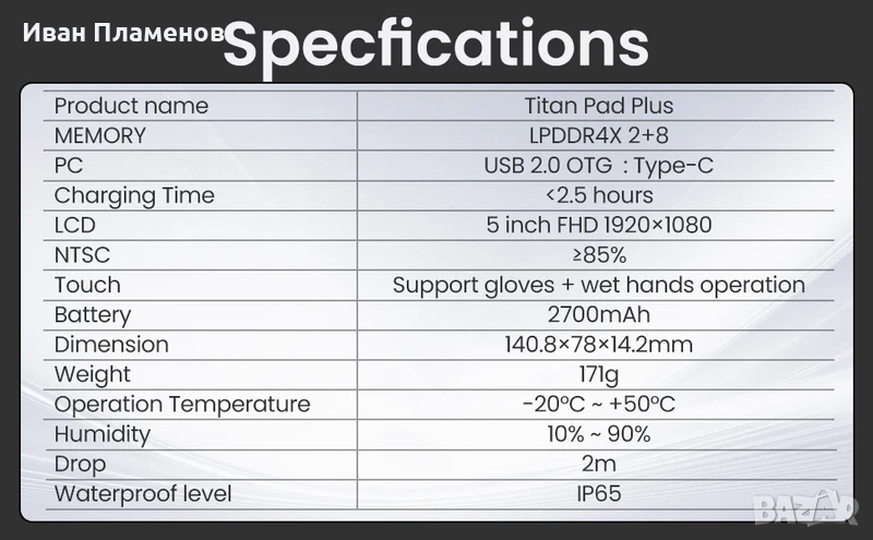 Пълна спецификация на продукта на български и английски: