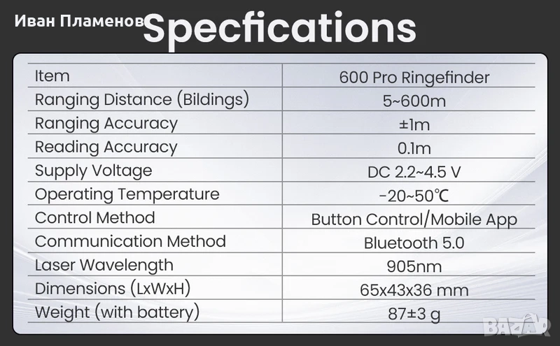 - Лазерен далекомер до 600 м (не вкл. батерия) - 450 лв. без ДДС