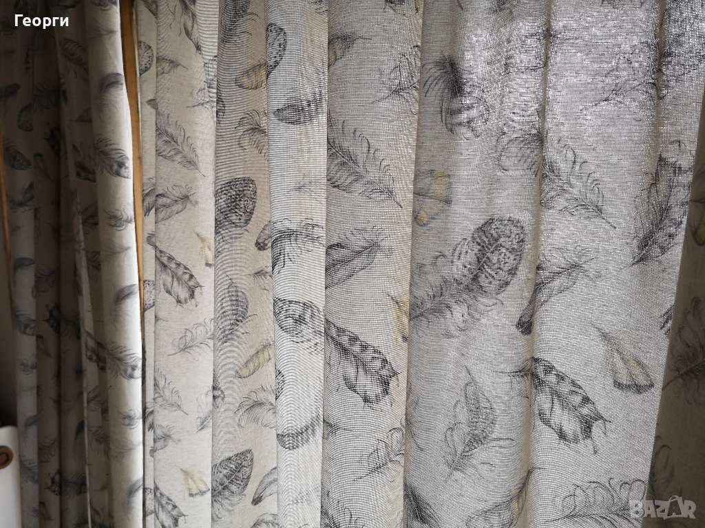 Комплект от 2 светлосиви пердета с приятна шарка на пера. Подходящи са за хол или дневна, тъй като пропускат светлина.