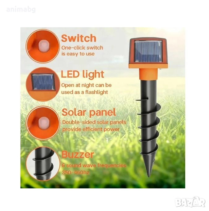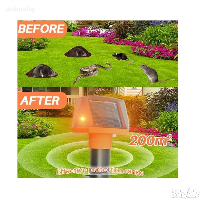 Безопасен и екологичен: Соларен репелент за вредители няма да навреди на животни, растения и хора. Няма мръсни химикали или пестициди, няма капани, няма мъртви животни. Соларният ултразвуков репелент за животни се отървава от всички животни, като излъчва смес от ултразвук и силни мигащи LED стробоскопични светлини, плашейки натрапниците и вредителите да напуснат зоната. Зона на покритие - Сензорът за движение покрива дъга от 110 градуса наляво и надясно, разстоянието на сензора за движение може да бъде до 8 м, работната зона до 400 квадратни метра. -- След като домашният любимец остане пред устройството, PIR сензорът започва да работи. Подобрена ултразвукова версия - Неравномерната и променлива честота го прави по-ефективен при прогонване на най-агресивните животни с пасивна инфрачервена (PIR) технология за откриване на движение. Автоматично регулиране на честотния диапазон - 25KHZ-61KHZ, (PIR) открива движение и задейства ултразвуковия високоговорител, който излъчва тон, прогонващ животни на открито като мишки, плъхове, скунксове, кучета, котки, лисици, птици, прилепи и други. Водоустойчивост: може да се монтира в къщата, градината, двора или другаде. Устойчив на атмосферни влияния с водоустойчив капак.