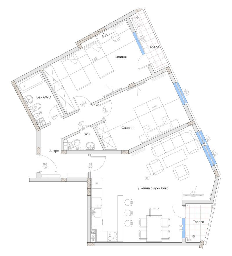 Разпределение: Светъл и слънчев тристаен апаратмент, състои се от просторна дневна 35кв.м. с кухненски бокс и трапезария и излаз на тераса, две големи самостоятелни спални: 15 и 18 кв.м., голяма баня с тоалетна 5кв.м., втори санитарен възел, входно антре и още една тераса.