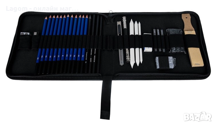 - 32 ЕЛЕМЕНТА Y – комплектът разполага с много голям избор от елементи за скициране, рисуване и др. Можете да избирате от моливи с различна мекота, парчета въглен, гумички и много други полезни инструменти за писане, които са полезни при работа.