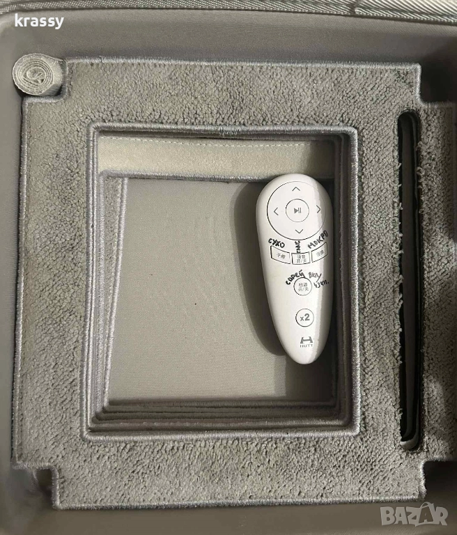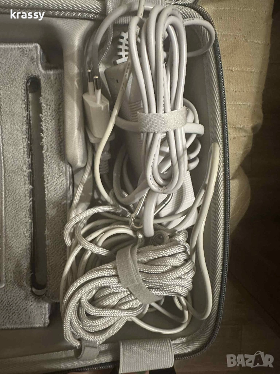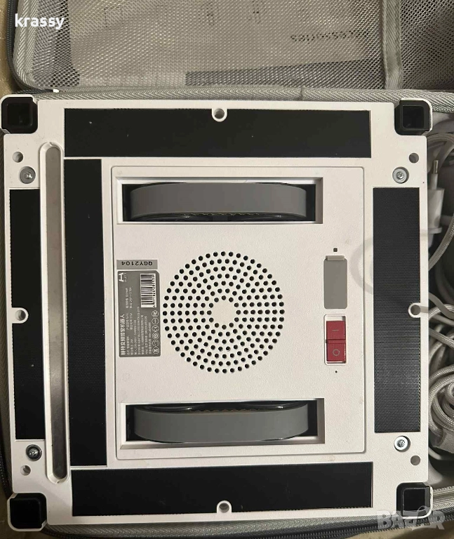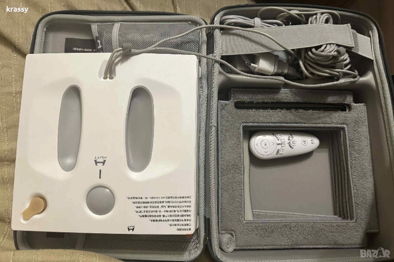 използва от робота, само когато прекъсне електричеството) Робота е в удобно куфарче, което да носите с вас. То съдържа: 1бр. робот за миене на прозорци Hutt W66; 1бр. захранващ кабел с дължина 7.5m; 1бр. адаптер 7бр. микрофибърни кърпи; 1бр. обезопасяващо въже 5m.; 1бр. контейнер за вода 150 мл.; 1бр. дистанционно; 1бр. шише за пълнене на резервоара. Роботът е използван броени пъти!