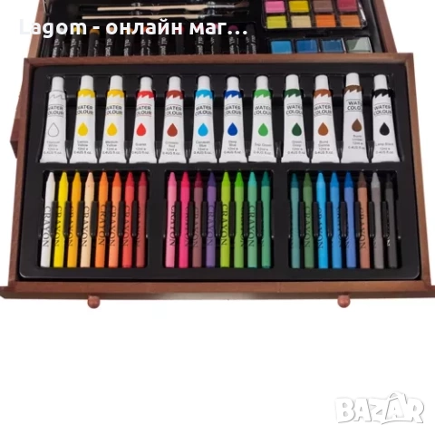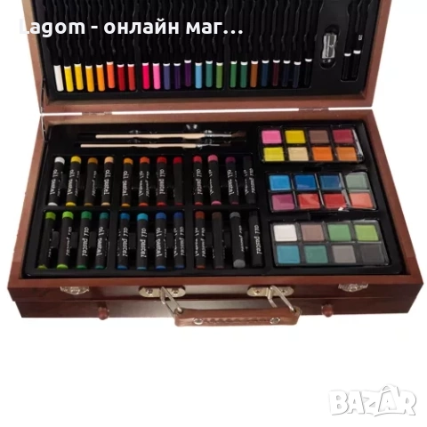 - ДЪРВЕН КУФАР С ЧЕКМЕДЖЕ – детският комплект за рисуване има практичен дървен куфар, който е снабден с ключалка и дръжка. Благодарение на това транспортирането на съдържанието на куфара е удобно и много лесно.