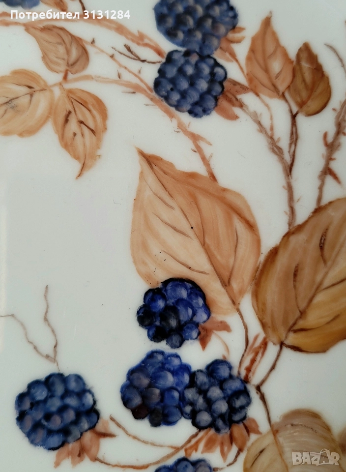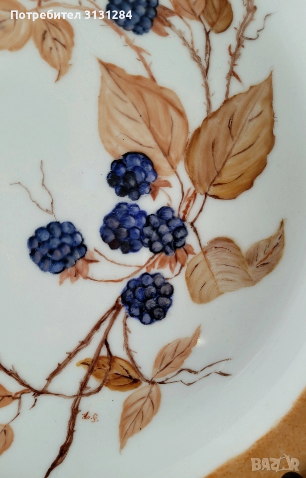 Чиния от известна немска фабрика за порцелан, ръчно рисувана с къпини от художник на порцелан H. Fisher. Авторская подпис. Миналият век. Размер 26 см.