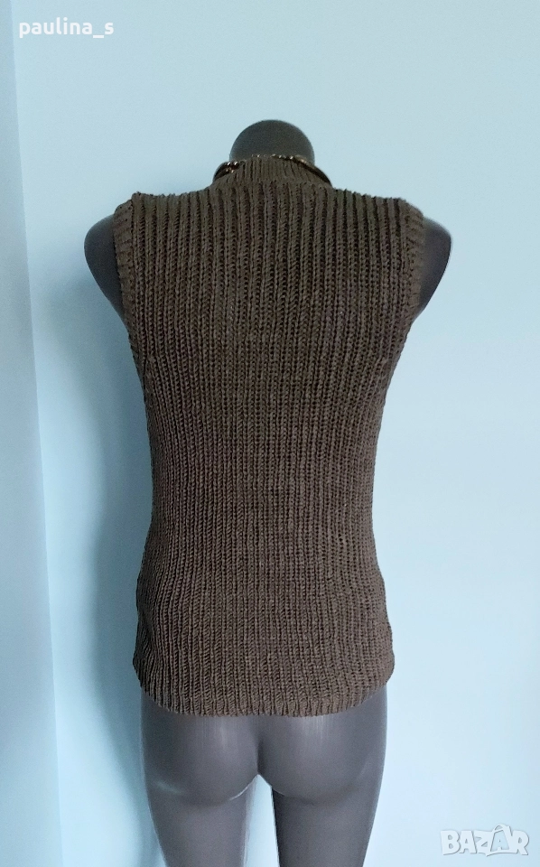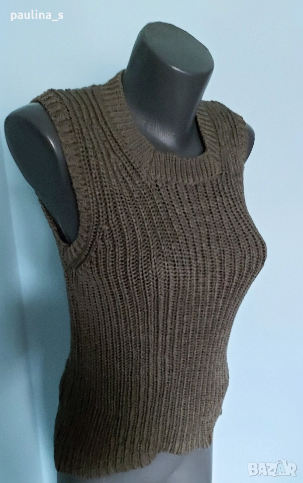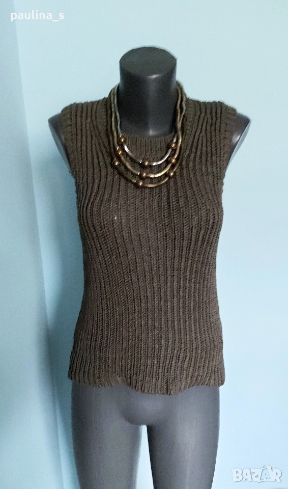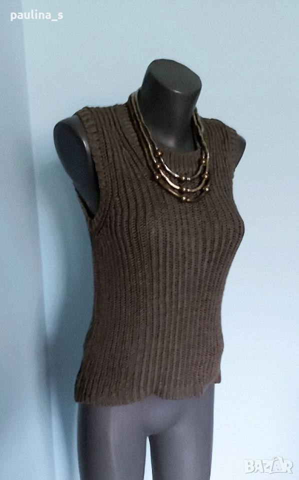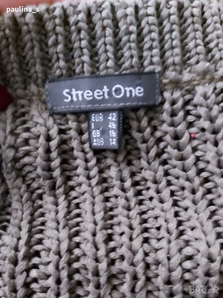 2️⃣. L / 3XL - "Street one" by Gap. Цената е крайна, без пазарлъци 24,99лв / 12,5 евро. Стилен памучен пуловер без ръкави, цвят Шам фастък. Деколтето е трапец, мноого сладко. Плетката е рехава, преждата е памук с примеси и дава еластичност, покрива няколко размера, изброени са. Цветът е неутрален и подхожда на всичко.