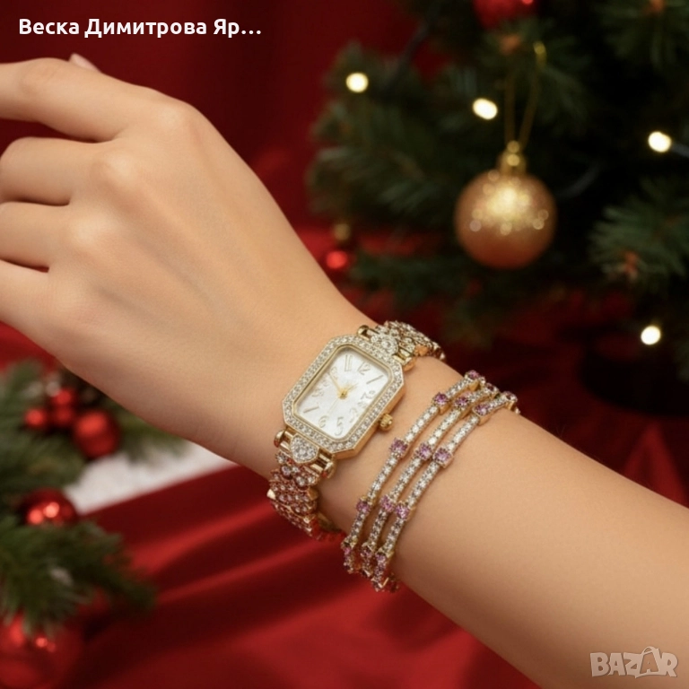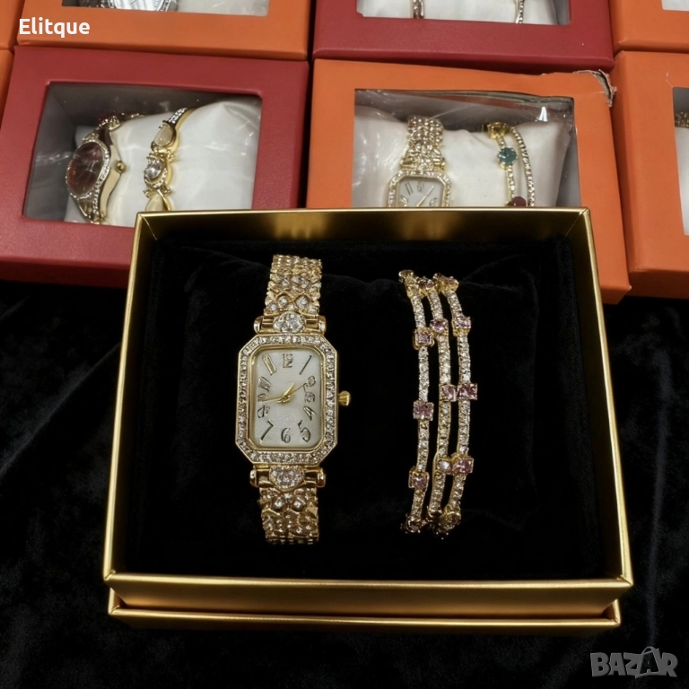 Материали: метален златист корпус, декоративни кристали, метални елементи и нежни камъчета в розов и прозрачен цвят; Елементи в комплекта: 1 часовник + 3 гривни; Размери: регулируеми гривни; компактен корпус на часовника; Цветове: златисто, розово, прозрачен кристал; Безопасност: хипоалергенни материали; Опаковка: луксозна подаръчна кутия – удобна и за съхранение.