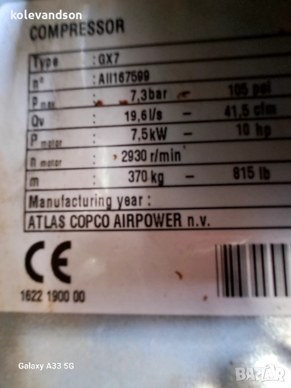 Винтов компресор Atlas Copco GX7FF-2900 моточаса