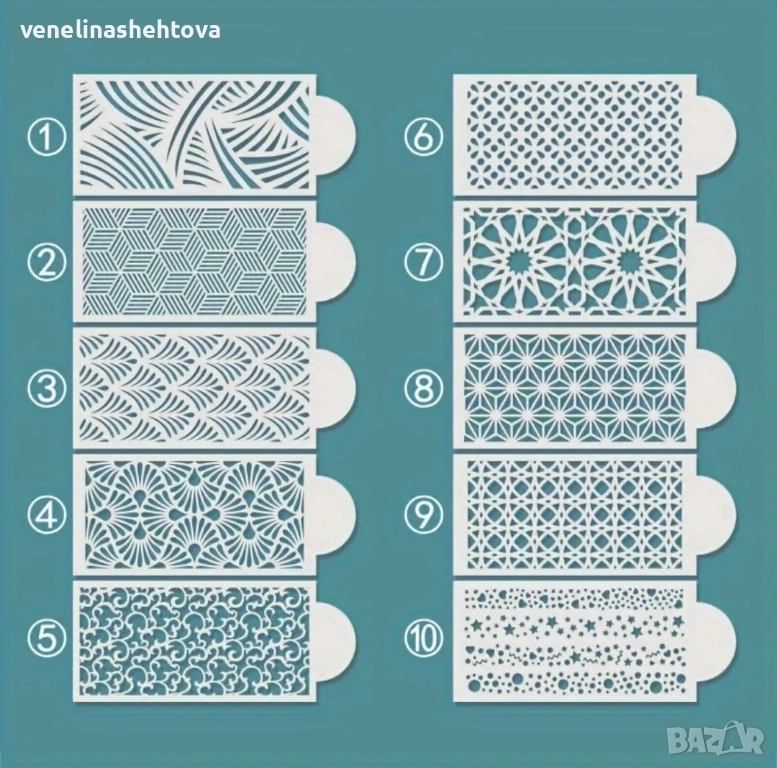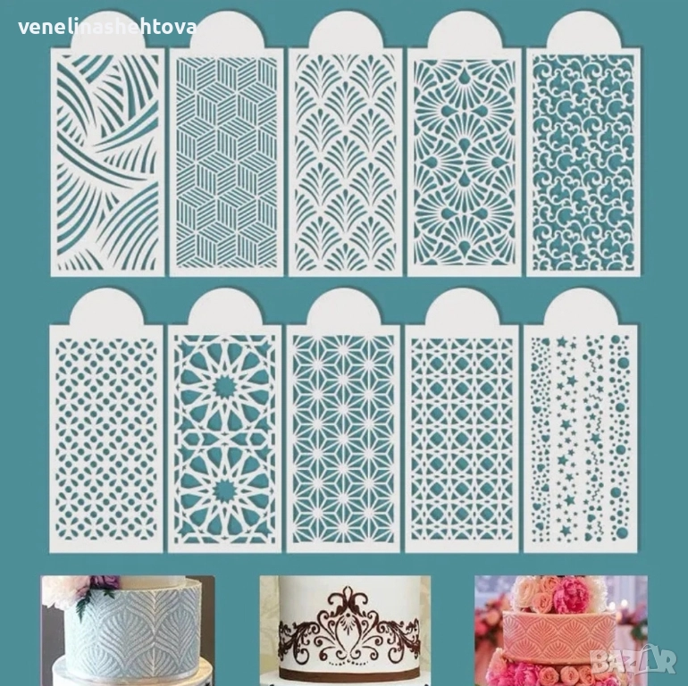 Комплект 10 броя шаблона за многократна утотреба, за декорация на торта и различни други повърхности. С тях може да украсите вашите торти бързо и лесно с пудра захар, какао, спрей и др. Също така са идеални за приготвяне на различни проекти като скрапбукинг, релеф, дърво и др.