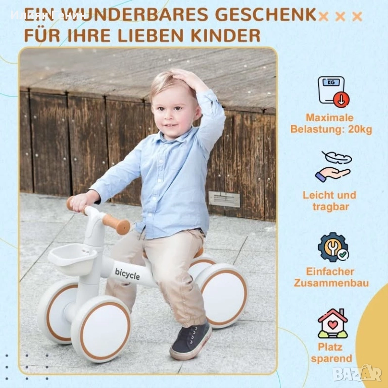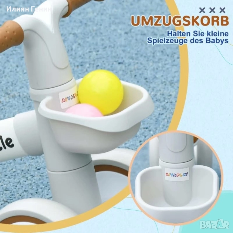 Регулируем комфорт: Този детски велосипед разполага с двупосочна регулируема седалка, която може да се мести с 2 см напред и назад, което го прави подходящ за деца на възраст от 1 до 3 години. Включва и подвижна кошница за играчки и други важни неща.