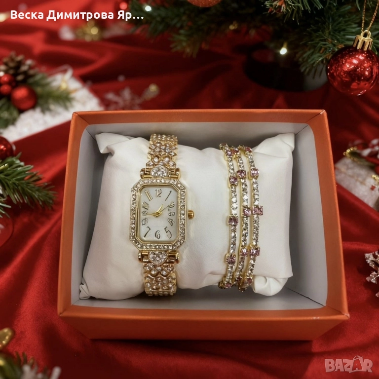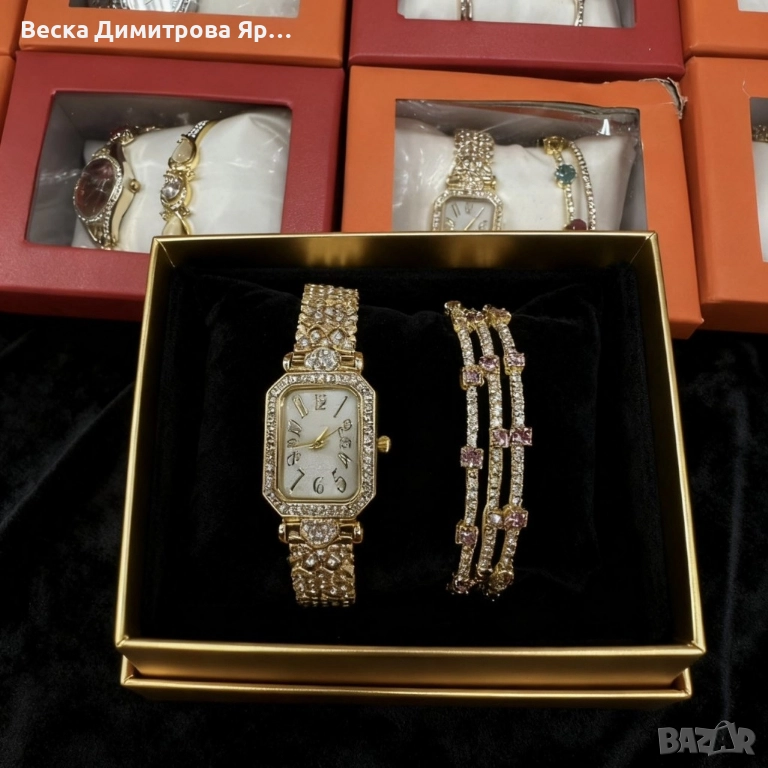Луксозен дамски комплект: часовник и гривни в златист цвят → Обява 52561826