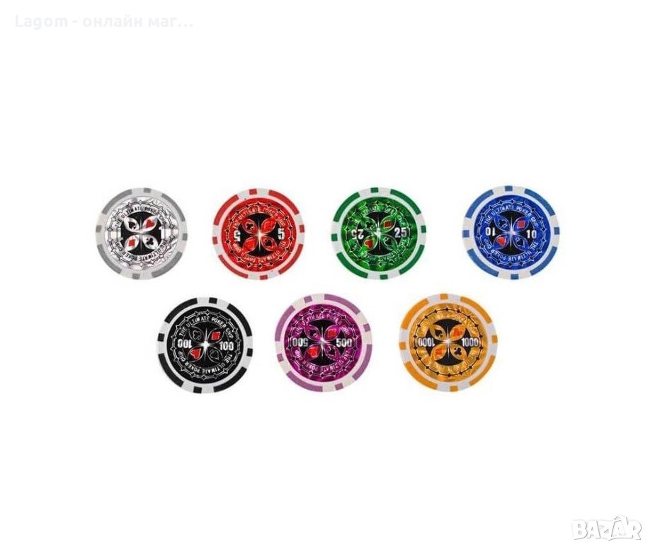 Жетоните са изработени от здрав композитен материал с метална вложка, имат приятна тежест и усещане за истинско казино. Подходящ за игри Poker, Texas Hold’em, Blackjack и други картови забавления.