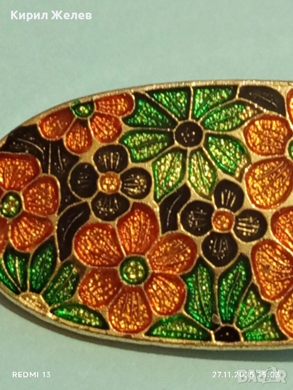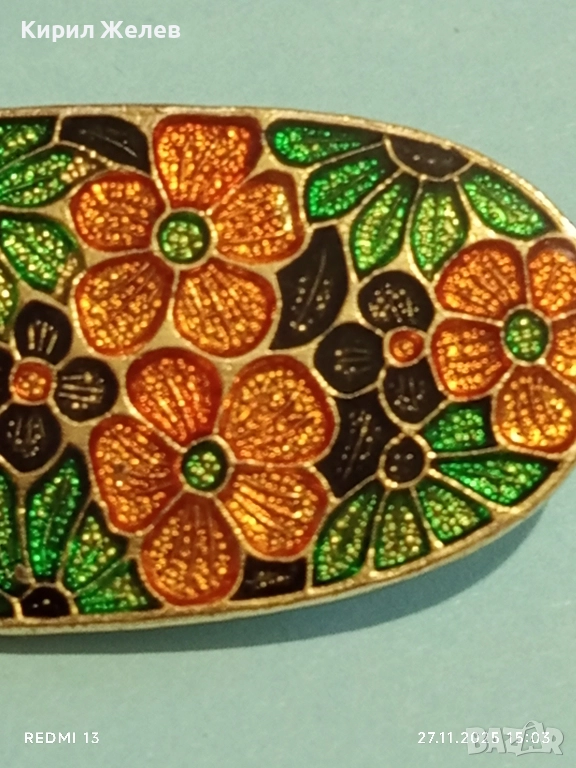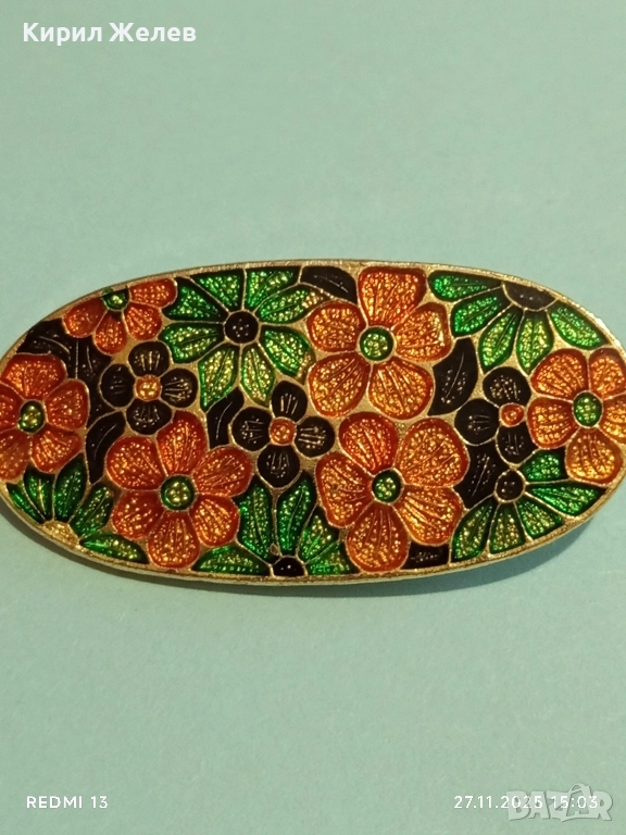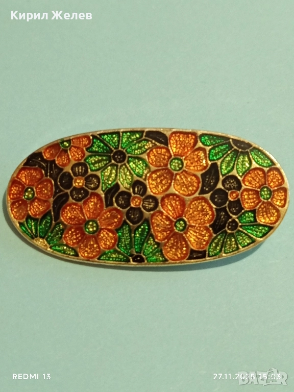 Винтидж емайлирана брошка с флорален мотив украсен в оранжево,зелено и черно 34563