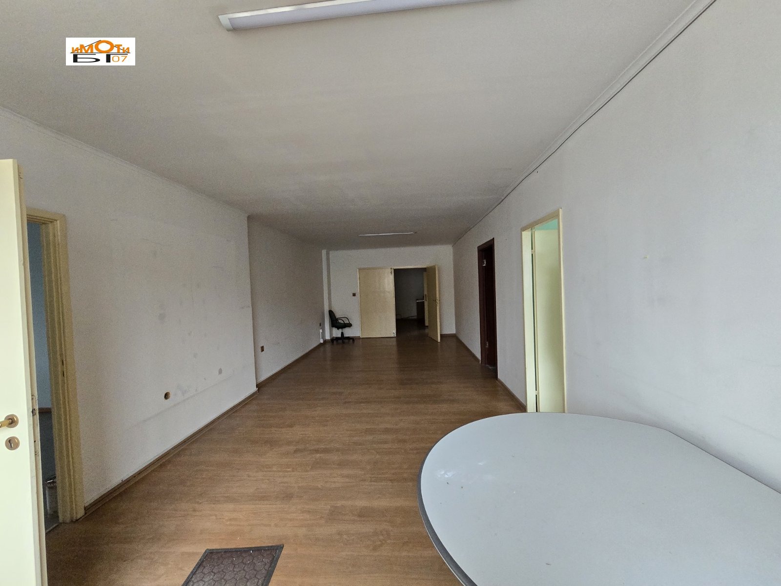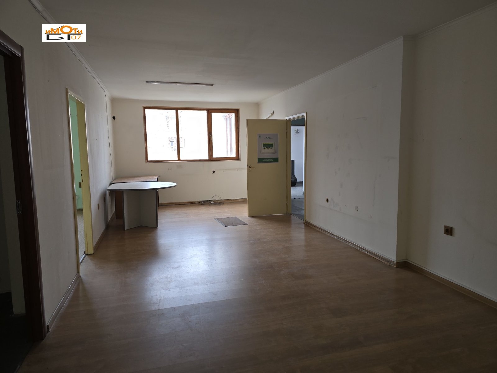 Разпределение: коридор, голяма зала, осем самостоятелни помещения, тоалетна на етажа. Офисът е разположен на трети етаж. Отоплението е чрез електричество. Има възможност за наемане на паркоместа на цена 100 евро.
